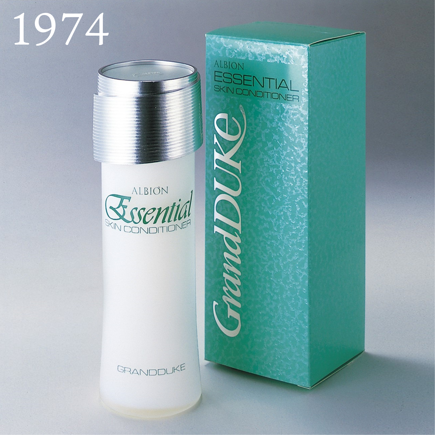 最高級ライン「グランデュ―ク」の“素肌美”を象徴する化粧水として初代スキンコンディショナーは誕生しました。1970年代、ピンクや紫などの色つき化粧水が主流だった時代に登場した、純白の化粧水。それは、見た目の新しさのみならず、スキンケア技術の革新でもありました。肌を引き締める収れん効果と潤いを与える保湿効果を両立できないか。そんな困難な命題に対し、油の粒子サイズを最適化するという斬新なアプローチを導入。「肌なじみの良さ」と「美しい白」をあわせて実現したのです。この挑戦と成功が、今日まで愛される“スキコン”の歴史を切り拓きました。