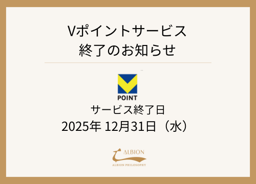 この度、2025年12月31日(水)をもって、「アルビオン フィロソフィ 横浜店」におけるVポイントサービスを終了させていただくこととなりました。
